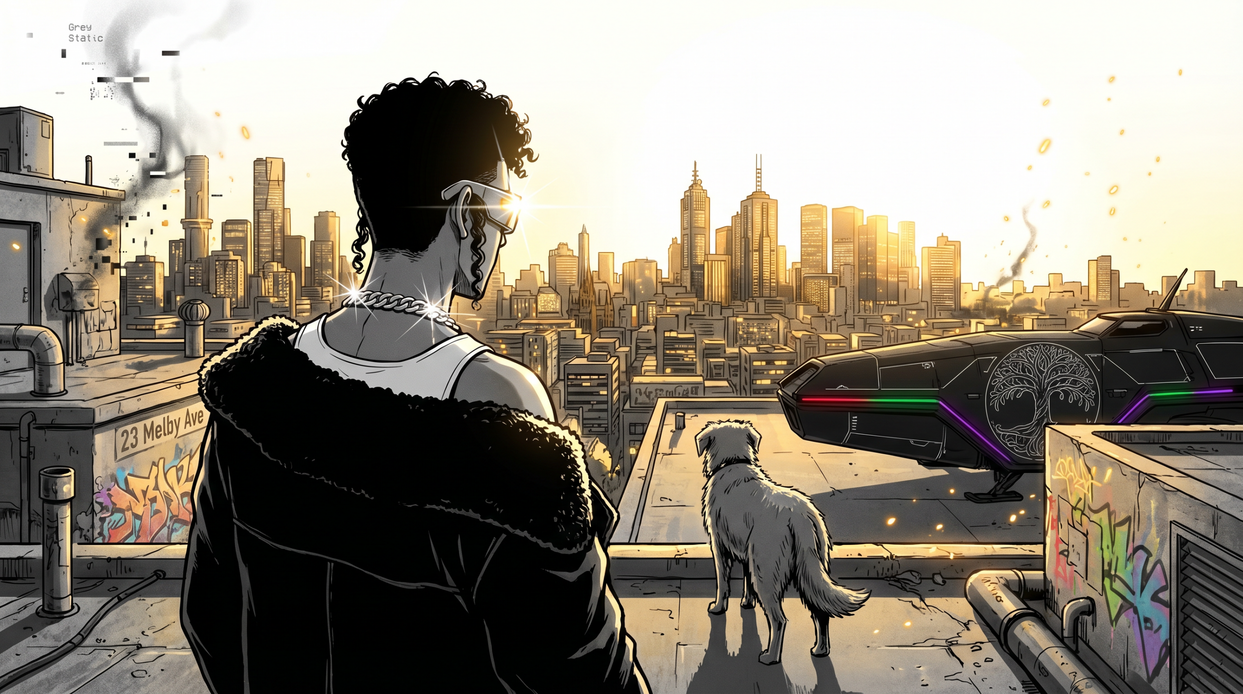 Back on the roof. Dawn now, properly. The Melbourne skyline in early light. D'Ni57er standing, back to the viewer, looking at the city. Payot visible. Chain catching the first light. White tee under the black. Bagel standing beside him — also looking at the city. Both of them just looking. The Merkavah is the building underneath their feet. The engines are always on. Except when they're not. Except on Shabbat. Except at NPP.
